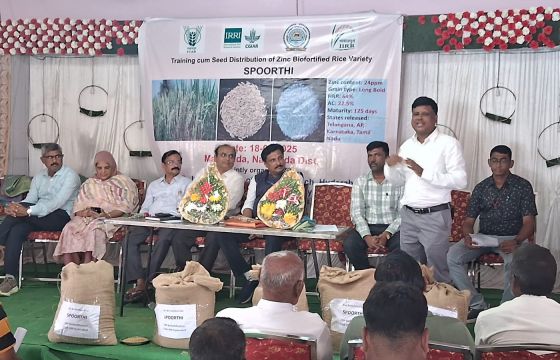 IRRI, ICAR–Indian Institute of Rice Research (IIRR), and University of Agricultural Sciences, Raichur, conducted a training/seed distribution program in Raichur, Karnataka, and Marrigudem village, Nalgonda District, Telangana. Held at the University of Agricultural Sciences and in a local farming village, the events marked the beginning of Spoorthi’s deployment, with 50 quintals of seed provided to selected farmers for multiplication and scale-up.